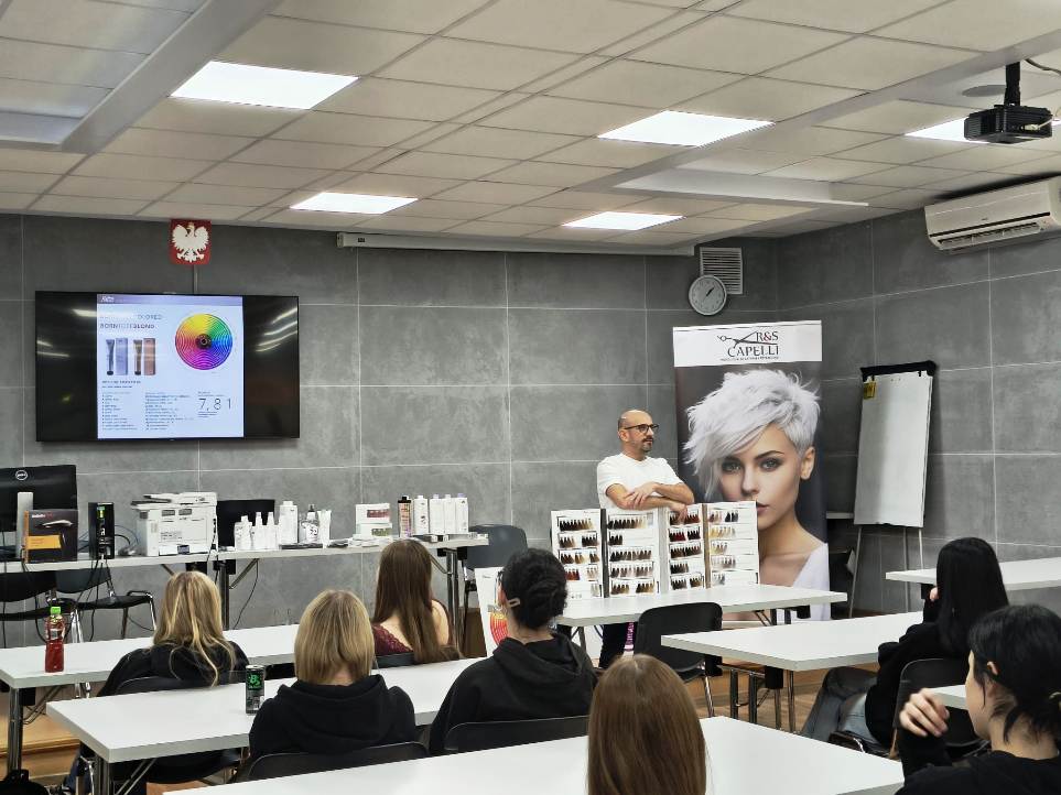 17 listopada 2025 roku uczniowie, kształcący się w naszej szkole w zawodzie fryzjer, uczestniczyli w spotkaniu z  przedstawicielem hurtowni fryzjerskiej R&S CAPELLI – panem Sebastianem Zioło.